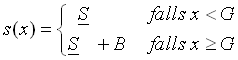 Die Kompensationsfunktion s(*) stellt das Entlohnungssystem für den Manager dar. Sie ist direkt abhängig von dem Ergebnis x, das in diesem Bereich tatsächlich erzielt wird. Dieses Ergebnis x wird mit einer Sollgewinnvorgabe G verglichen. Ist x kleiner als G, so soll der Manager einen Basislohn erhalten. Übersteigt das Ergebnis jedoch die Vorgabe, so soll der Bereichsleiter durch einen Bonus B belohnt werden. Bei diesem Modell stellt der Sollgewinn ein vorgegebenes Gewinnbudget für den Manager dar. Es wird für s(x) a priori folgende Struktur festgelegt:[31]